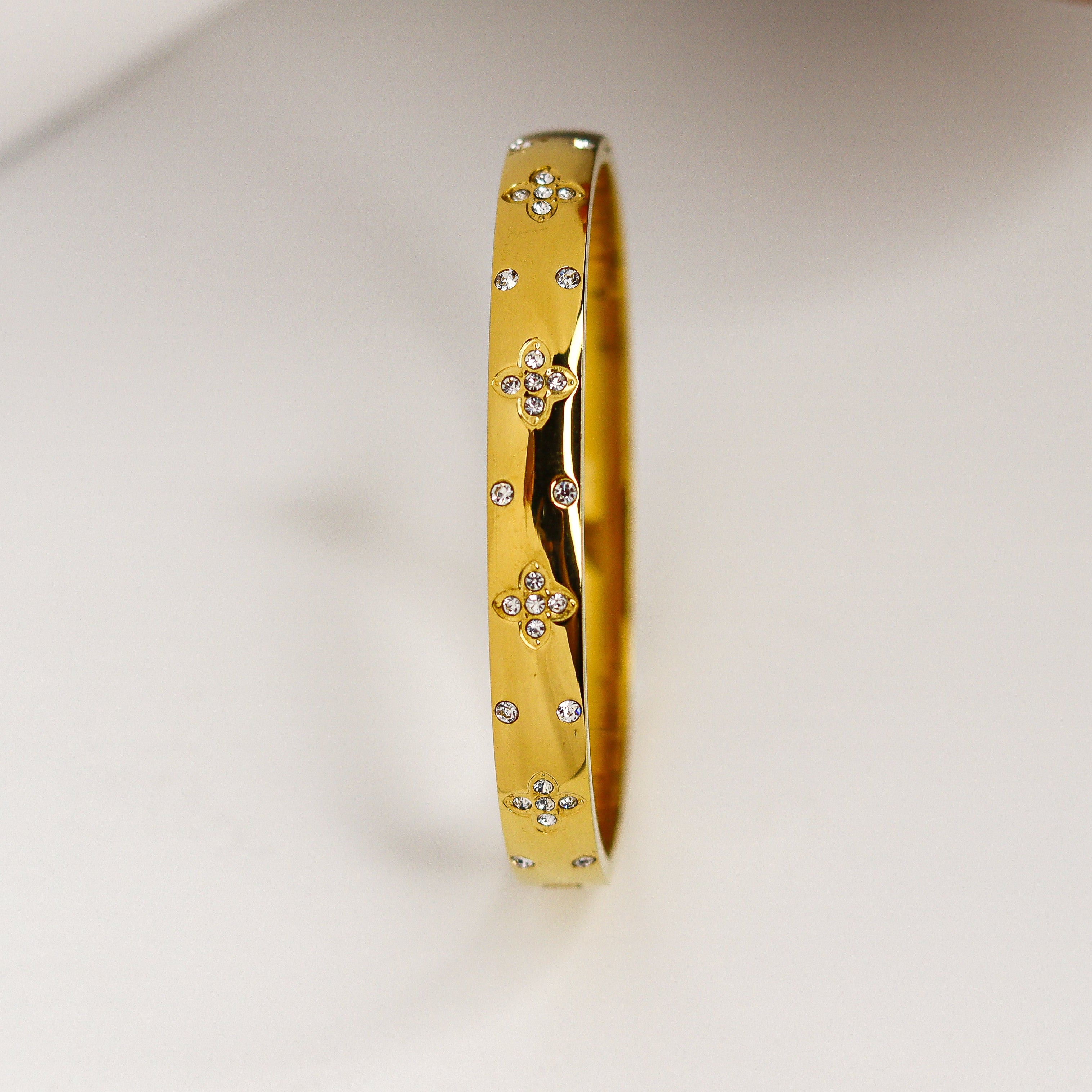 Gold bracelet with small diamonds on a light gray background
