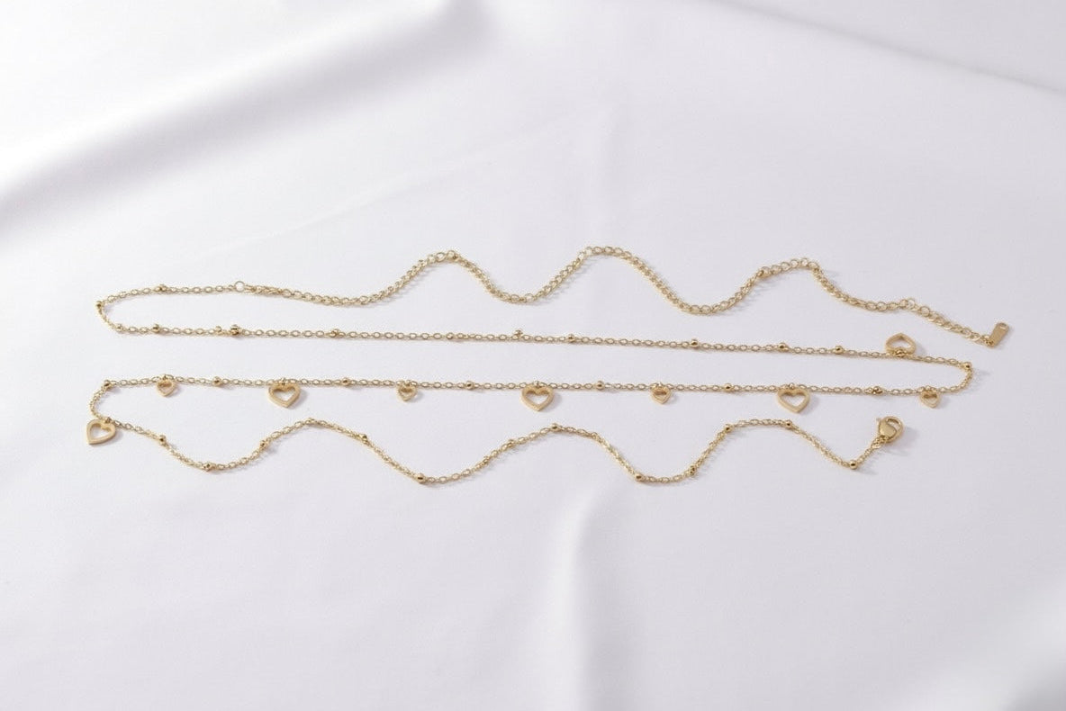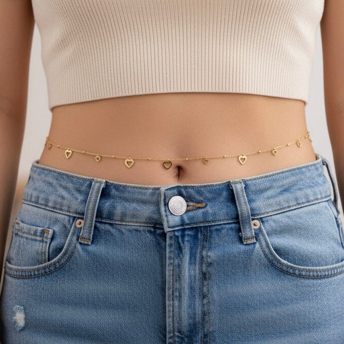 Style: A delicate and charming single-strand waist chain that sits gracefully just above the hip. The fine chain is interspersed with alternating accents: small, polished open heart charms and tiny gold bead stations, creating a feminine and fun accessory with a touch of whimsy.