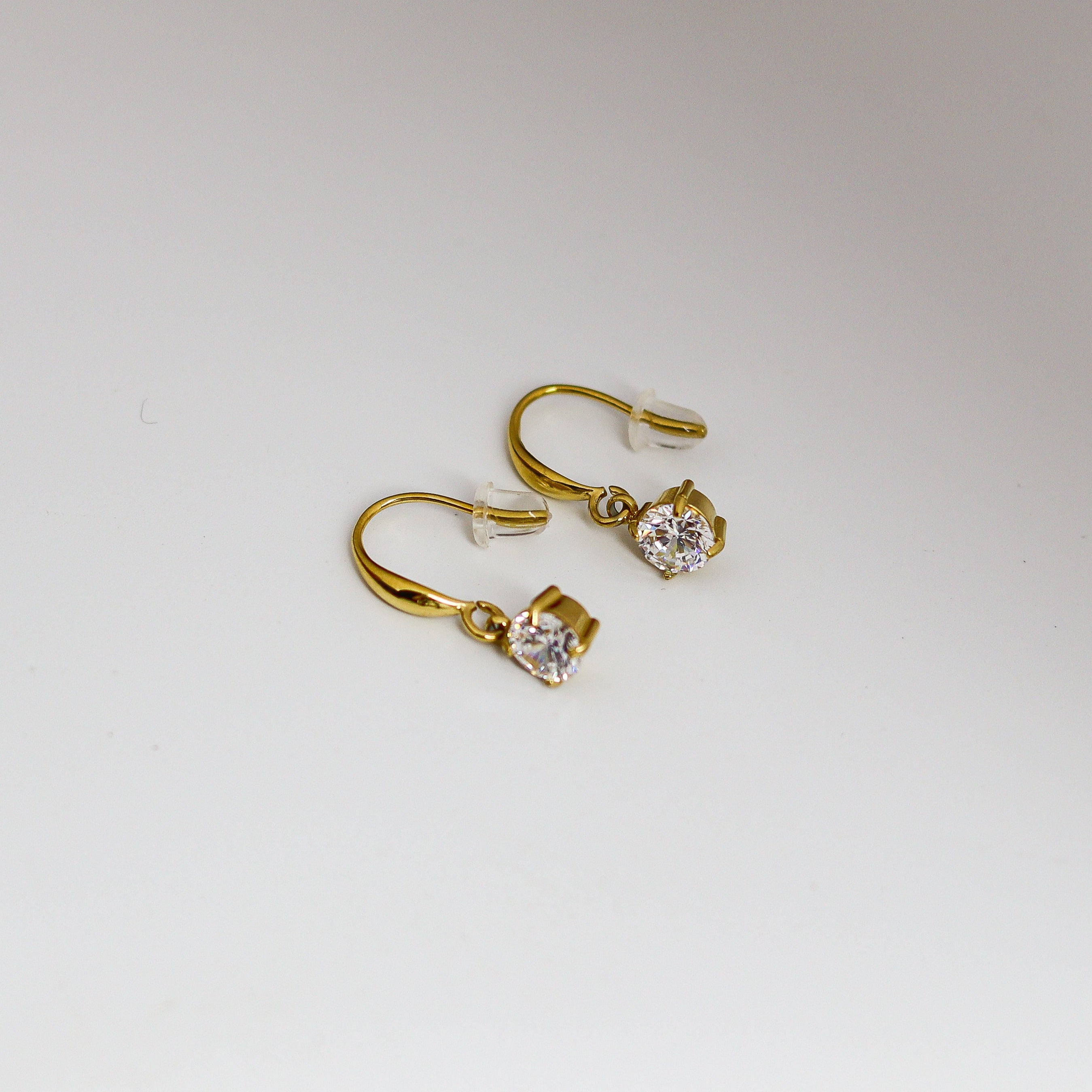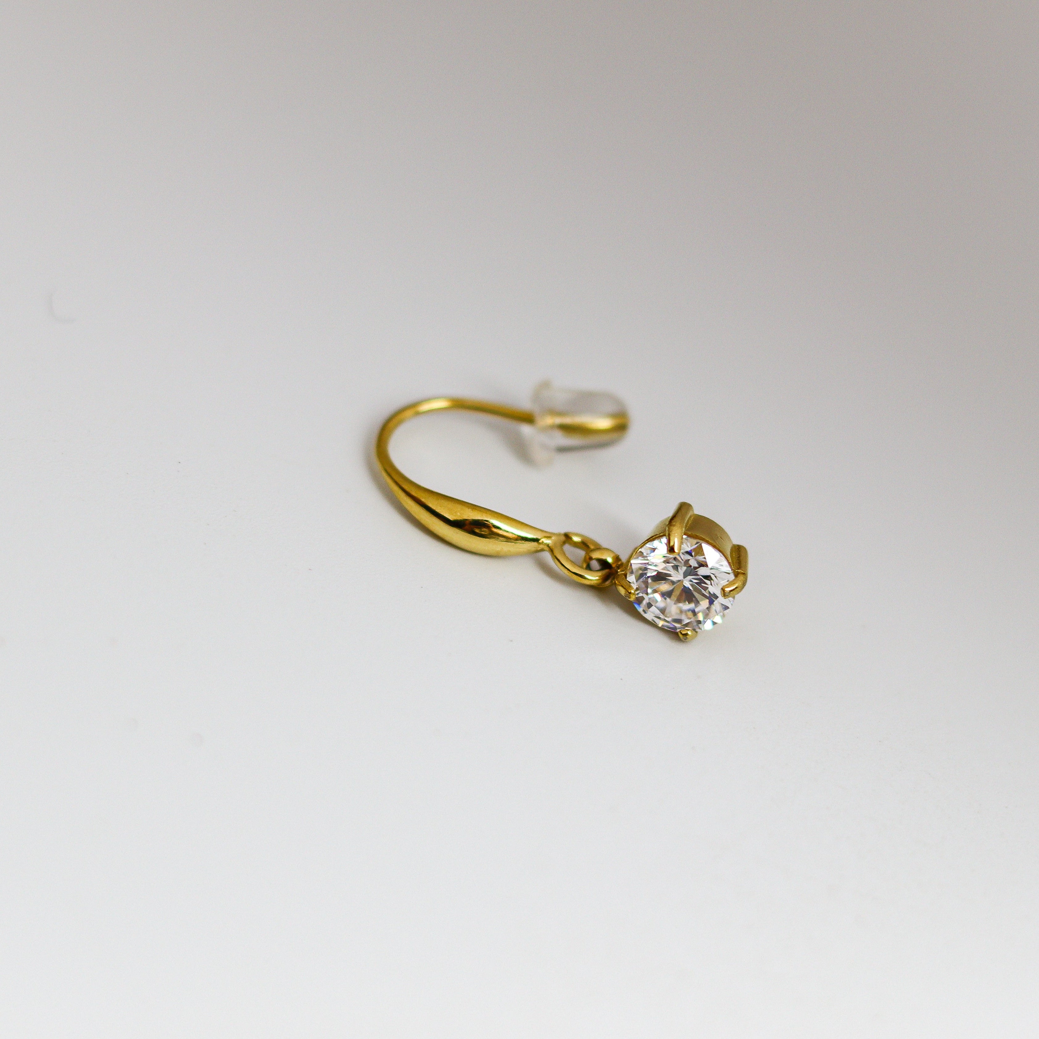 Style: A timeless and refined drop earring featuring a single, dazzling round cubic zirconia (CZ) stone. The stone is held securely in a multi-pronged, crown-style setting and suspended from an elegant, curved French wire or lever-back closure for maximum sparkle and movement.