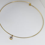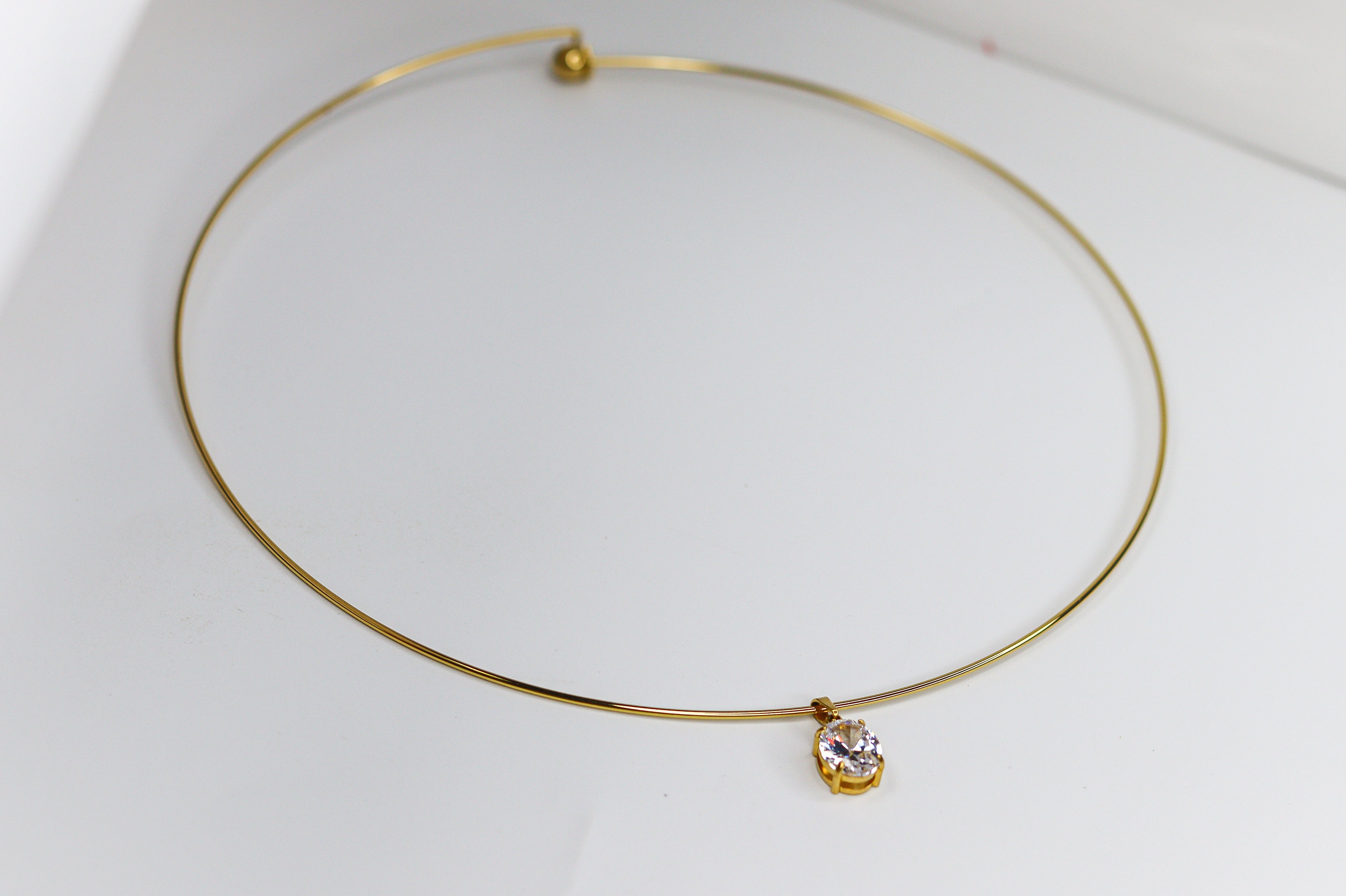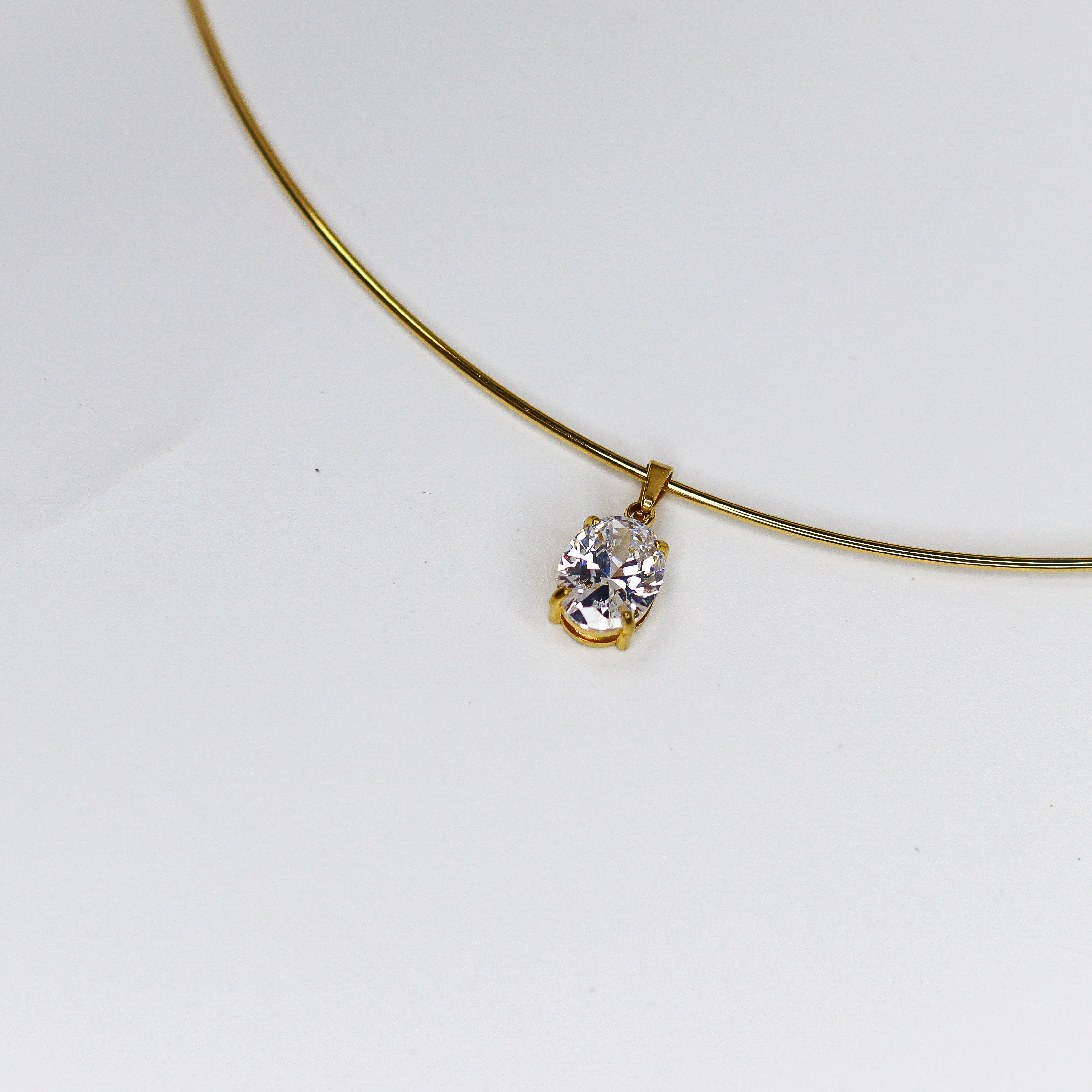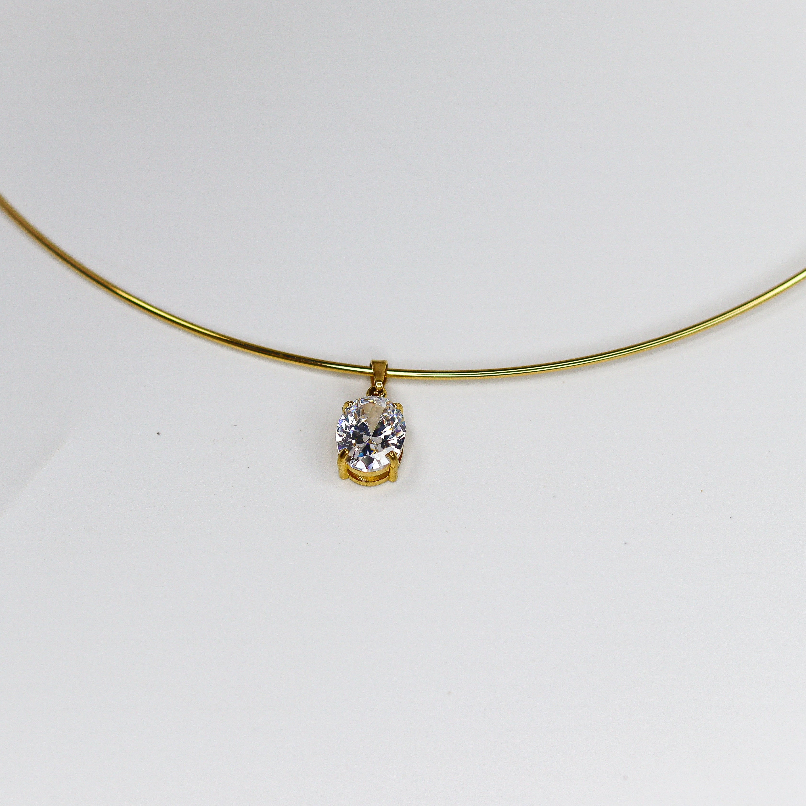 Style: A graceful gold-toned collar necklace adorned with oval shaped sparkling solitaire